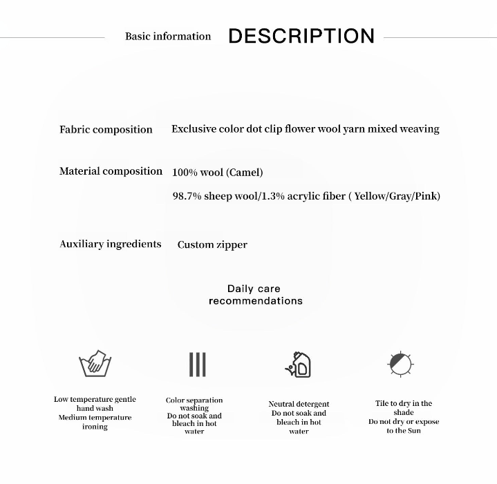 Using exclusive spinning technology, the wool fibers are carded into fine particles, then blended with wool and woven repeatedly to ensure even distribution of the color dots. The process is intricate, resulting in a fabric surface covered with star-like colorful dots, creating a unique and distinctive style.