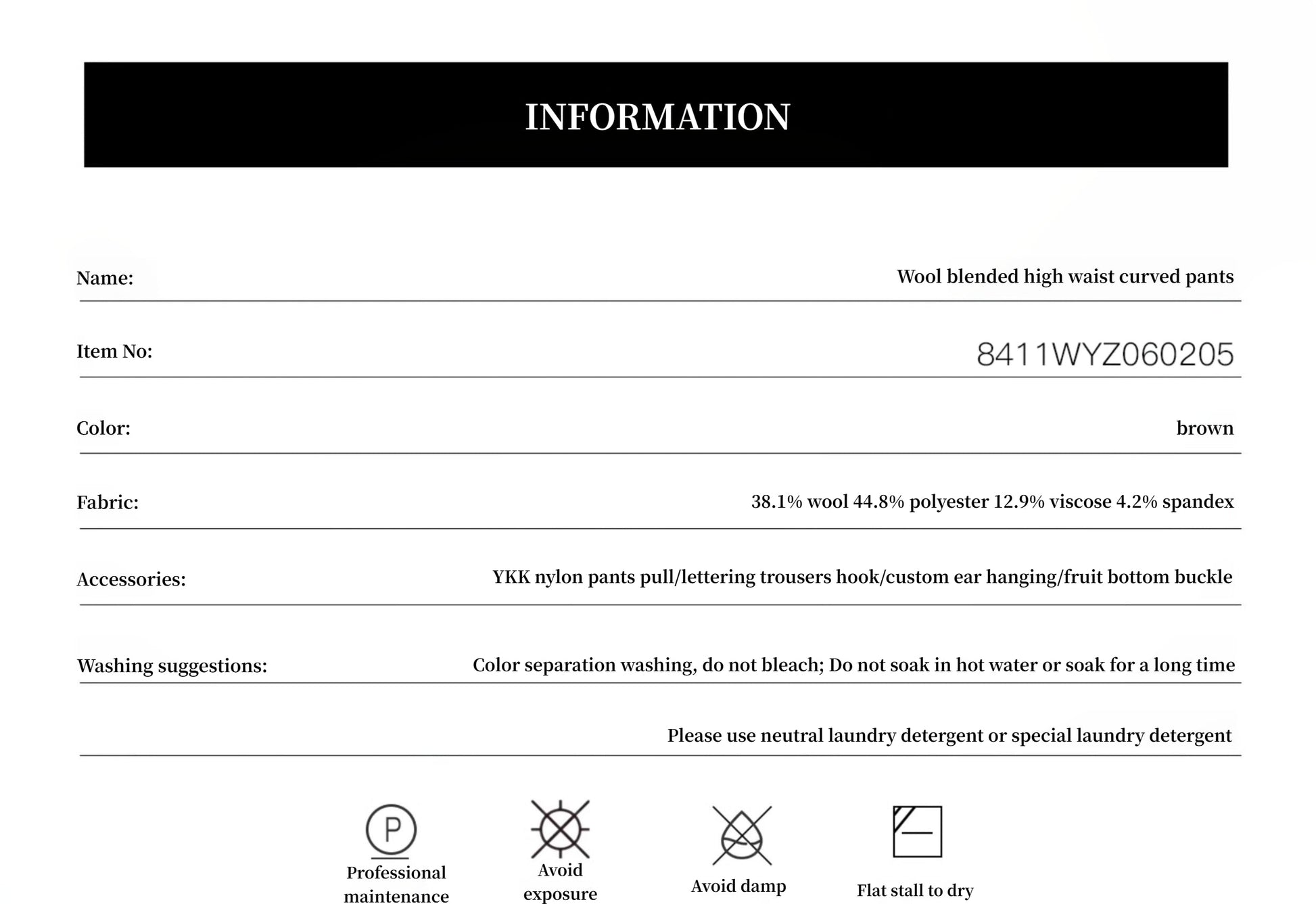 Selected high-quality wool fiber blend, exclusive weaving technology to create texture, dry and comfortable finished garments, skin-friendly, drapey, and three-dimensional cutting to create a three-dimensional curved pants body, side seams moved back to increase the sense of design, with loose pants body fashionable. High waist design visually optimizes proportions and makes you look taller and thinner, and semi-elastic waist design increases practicality, casual, and fashionable.