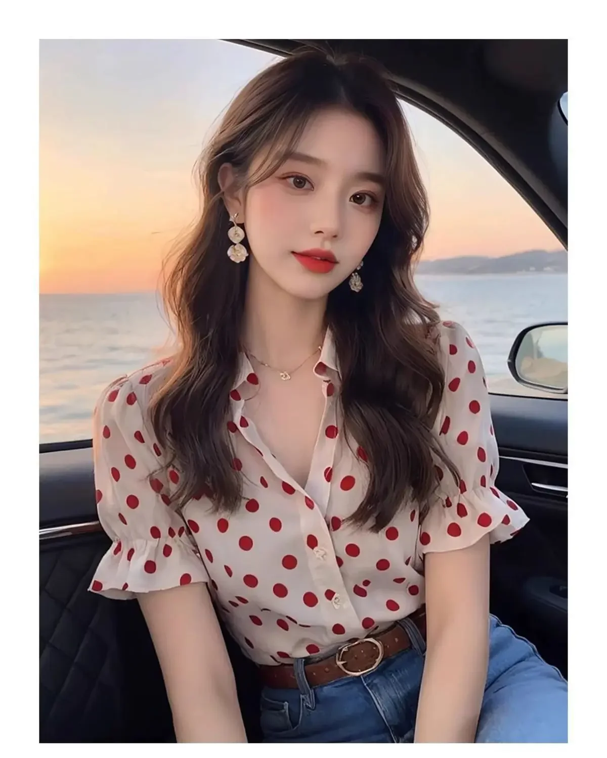 Polka Dot Shirts Petal Sleeve Ruffles Ladies Blouse