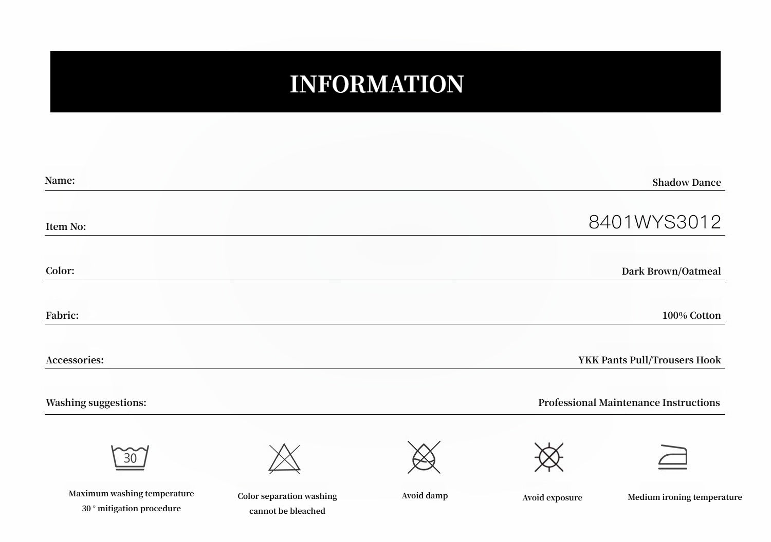 Exclusive customized accessories, color matching double pressure line dividing line, exquisite and stylish Imported color-matched YKK zippers and trouser hooks make it easy to put on and take off, with practical details. The texture is high and the side seams are processed with precise color-matching topstitching and double-pressing to make the trousers more crisp, sturdy and wear-resistant.