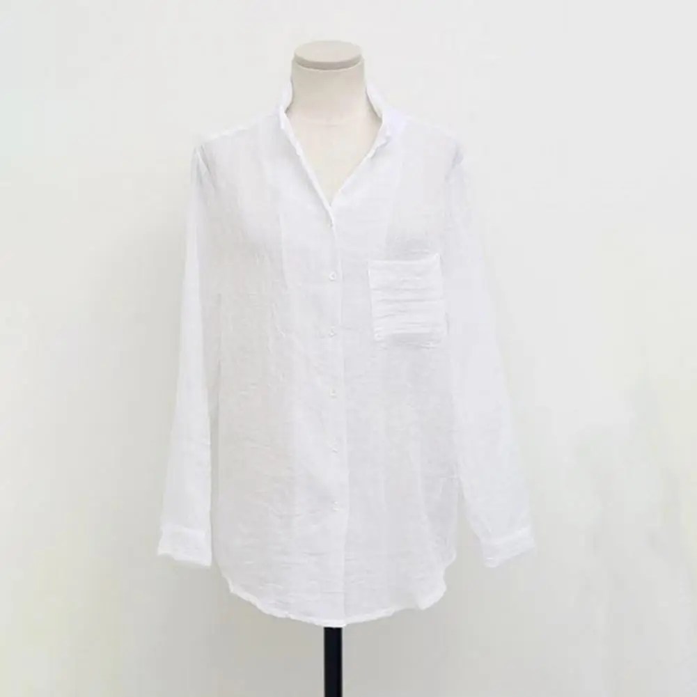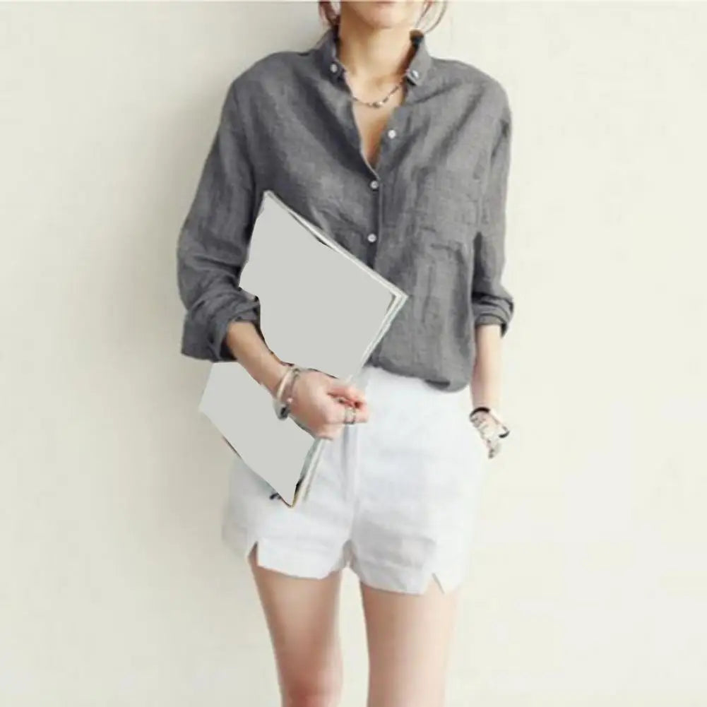 Women Autumn Korea Solid Cotton and Linen Blouse Vintage Solid Thin Loose Shirt - Casual Long Sleeve Korean Tops