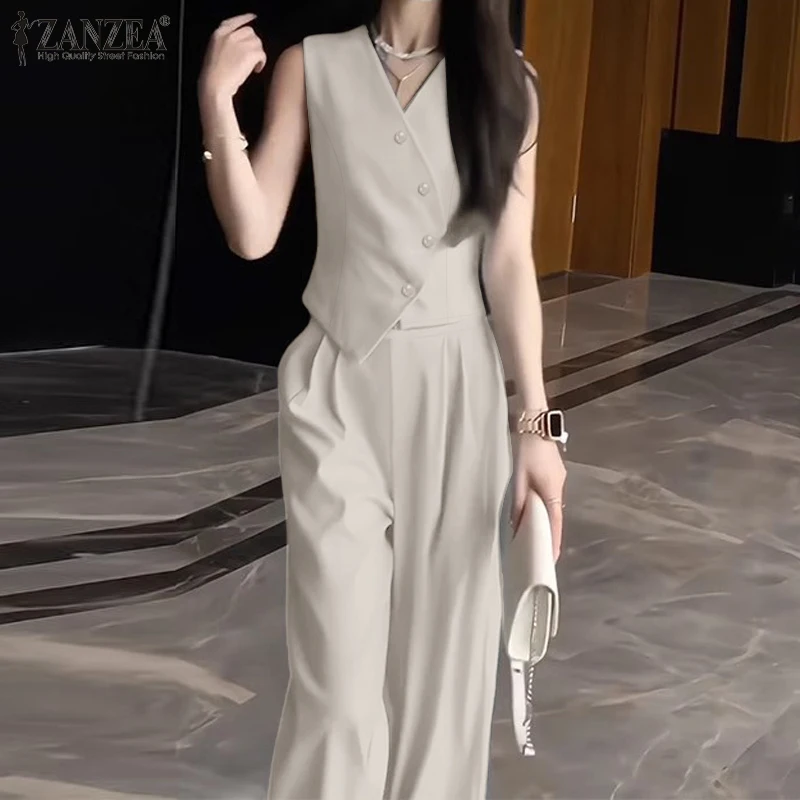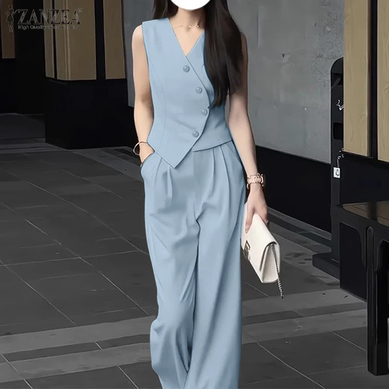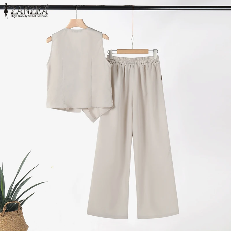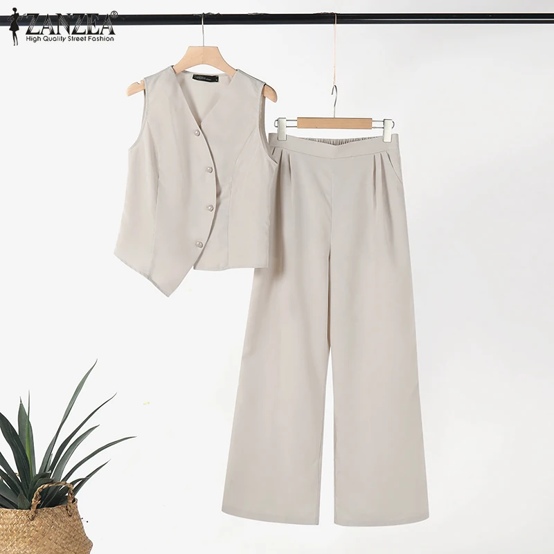 ZANZEA Summer Women 2-Piece Sets Irregular Vests Tops Fashion Solid Elegant Pant Sets Commute Wide Leg Trouser Outfits